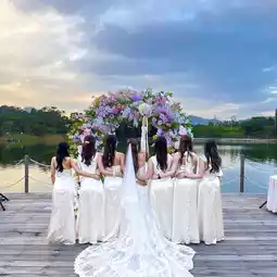 The weather was beautiful that day, the sun was shining and it didn't rain. The photos were so beautiful! 💖 The night is also lit with decorative lights, the scene is very romantic, completely a fantastic lakeside wedding atmosphere!