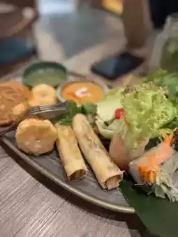 Thai Snack Platter: Includes crispy spring rolls and shrimp cakes that are fried to perfection. They are crunchy on the outside, with a delightful texture inside, featuring fresh shrimp meat.