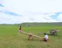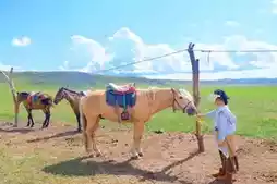 Besides flatland horseback riding, you can also ride up the mountain to watch the sunset, herd sheep on horseback, cross Hailistai, or ride a motorcycle. Kids can make dairy products (by appointment), milk cows, ride camels, and take a small train. Prices vary by activity. The herders also built manual playground equipment on the grassland like seesaws, swings, and balance beams. Our little Huang had a great time playing with "Little Subuda" and even blended in with the local herder family.