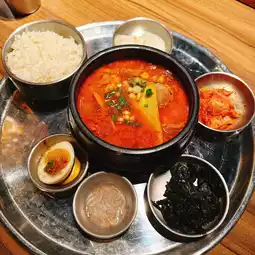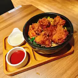 Spicy beef soup rice, fried chicken bibimbap, Korean fried chicken rice cake (secret sauce), crispy fried seaweed vermicelli rolls, condensed milk fried rice cake, green grape flavored soda, watermelon flavored soda - set meal for two $988