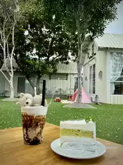 🪵 Barn-style cafe with a rich kid vibe. Come visit the farm. ☘️ Good atmosphere in a European-style cafe concept. There are beautiful and cool corners to take pictures. White barn, grass field, natural pond, white wooden house, decorations, flower garden, flower hoops, swings in the grass field, etc.
