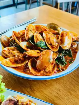 🥳 Koh Mak Restaurant, Hua Hin is a seafood restaurant that is famous for its spicy and fresh food. The atmosphere of the restaurant is stylishly decorated in a clean blue and white tone. There are both indoor and outdoor seating areas to choose from according to your preferences. There is a wide variety of food to choose from, including fresh seafood and rich Thai food. The staff is friendly and attentive to customers, making you feel impressed every time you come to eat.