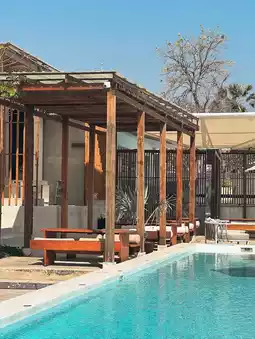 The restaurant and bar are next to the pool.