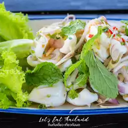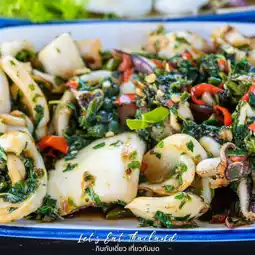 ✅ Stir-fried squid with chili, fresh garlic, and strong basil leaves. It's really spicy.