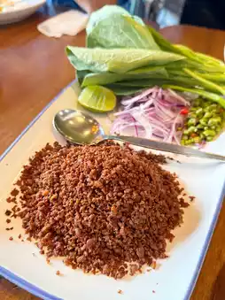 - Moo Kulao: A unique name and an unusual dish, but it's a must-try! It's minced pork that's seasoned and stir-fried, served with fresh vegetables. Loved it! The flavor is slightly salty, but still very enjoyable.