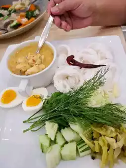 Khanom Jeen Namya Pu Khon 280 baht but there is a lot of crab meat, authentic coconut milk curry, good taste, delicious and rich, served with vegetables