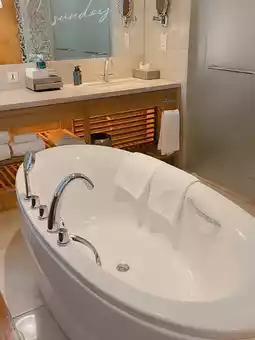 #Travel to save the world This Hua Hin trip of Ara took us to stay at the Intercontinental Huahin Hotel. We were warmly welcomed from the moment we got off the car, as expected from a 5-star hotel. We requested to celebrate our anniversary and the hotel arranged the room very cutely. There was even a cake. Most importantly, the cake was delicious!! The bathtub in the room was large enough for 2 people to comfortably soak in. The facilities were complete. The restaurant where we had dinner by the sea was very delicious. As for breakfast, I thought it was a bit ordinary. The accommodation was by the sea, the beach was beautiful, and it was fun to run around and take pictures. I was personally impressed and will definitely come back to use the service again when I have a chance.