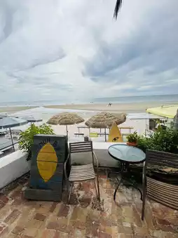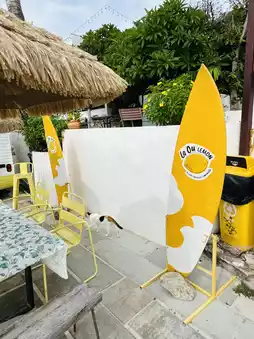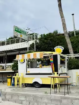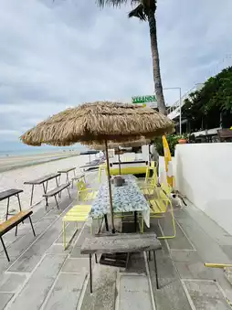 The atmosphere of the shop is cute, minimal in white and yellow, taking pictures is very bright, located on the beach, contrasting with the sky and the sea, super chill