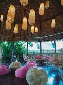 Located at Soi Hua Hin 75/2, Hua Hin Subdistrict, Prachuap Khiri Khan (inside The Secret Hua Hin Hotel), this cafe truly lives up to its "secret" name with its narrow entrance. It's a charming seaside cafe with a sweet and relaxing atmosphere, perfect for unwinding and enjoying the sea breeze. The ambiance is delightful, featuring a straw-roofed house-like zone and plenty of photo spots. The cafe has two floors, offering various seating options. The seaside area includes pink bean bags for lounging.