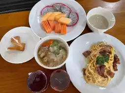 After some relaxation, a friendly and cheerful housekeeper came to take our breakfast order. The menu offered a wide variety of choices. I opted for spaghetti carbonara, mushroom soup, fried bananas, butterfly pea juice, and hot chocolate (and if you’re still hungry, you can order more!!!).