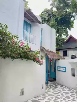 Resort de Paskani is both a cafe and accommodations, and is a must-visit. The drinks are absolutely delicious! 🍵 The interior is beautifully decorated in a soft, Santorini-style style, with beautiful lighting.