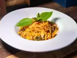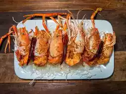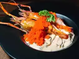Spaghetti with Shrimp Roe Cream: Grilled River Prawns: Soft noodles in a rich creamy sauce, topped with shrimp roe for extra flavor.