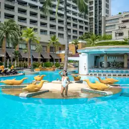 #The highlight is the large outdoor pool at the front of the resort, right next to the beach access. The atmosphere is shady and inviting. There are plenty of sunbeds around the pool, including both children's and adult pools, a waterslide, and a pool bar.