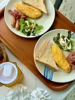 Breakfast set with eggs, bacon, sausage, and juice included 🥐🍳.