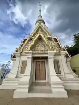 • 🛕 The large, striking white and gold Phra Maha Chedi Kesa Kaew Prasat, a stunning blend of Thai architectural styles.