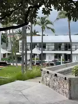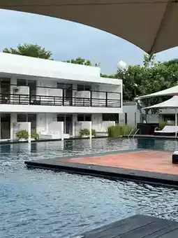 #VisitHuaHin: A luxurious beachfront resort emphasizing simplicity in a modern, minimalist style. Each room is designed to be airy and spacious, featuring soothing white tones, creating a sense of tranquility and relaxation. The resort also features an outdoor pool surrounded by tall trees, offering exceptional privacy. A highlight is the pool villas, which open directly into the pool. This accommodation is perfect for couples seeking private time, or families seeking a quiet, beachfront retreat where they can enjoy a leisurely morning stroll.