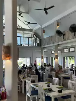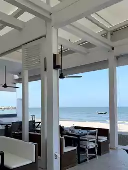 The next day, we took a taxi into Hua Hin town and headed straight to the world-famous srna coffee shop. The black coffee is delicious, but it's only available for takeout. We continued down the road until we reached the world-renowned Oceanside Restaurant. At first, we just wanted to see if it was as beautiful as everyone said. But once inside, we were immediately seated... We didn't hesitate for a second. We sat down, asked for a menu, ordered drinks, and paid for the view. The restaurant is right on the beach, with fine white sand at your feet and the waves rolling in front of us. They even took advantage of the location by installing a large mirror on the right wall, reflecting the ocean, creating the illusion of a 180-degree view. 🥲🥹😇 It was truly heaven...!! We sat facing the ocean for a long time, watching the waves crash against the shore. The boat drifted closer and further away on the water. A large fan whirled overhead, bringing a gentle breeze. The whispers of my neighbors became white noise, and my thoughts drifted away. I can't remember what I was thinking now, but I can tell you that the beauty of the clear sky and the sea had a cleansing and soothing power.