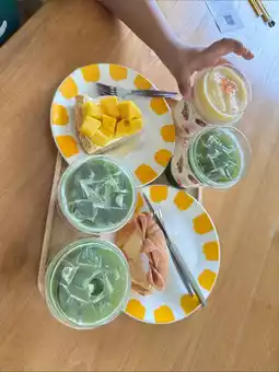 The atmosphere is great, the desserts are delicious, and the view is beautiful. I love the mango tart. Every angle is beautiful, but I have to admit it's hot outside, but the view is beautiful, so I have to accept the heat for the best photos. There aren't many tables inside the air-conditioned room, but customers move quickly. Drinks don't have to wait long.