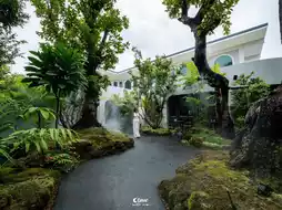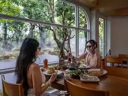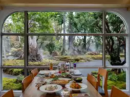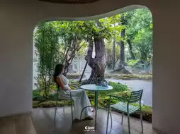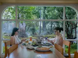 You can sit inside and enjoy the view through the glass windows. Or, sit in the outdoor area for a light forest-like feel. 🍃