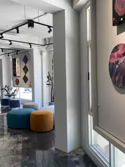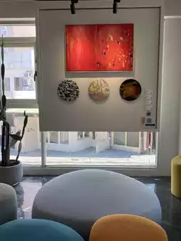 The window is full of colorful paintings