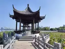The road around the lake is connected to Huangzhou Avenue, and further ahead it becomes Huxin Road. This is the southwest corner of West Lake, where Shuiyun Square is located. The lake is wide, with tall buildings along the shore. There is a pavilion on the plank road in the lake, called Sansu Pavilion. The lake is covered with lotus leaves, but unfortunately, the flowering season is over, and only a few lotus pods remain.