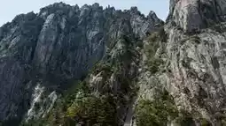 Focusing on Shixin Peak, Huangshan’s "gathering place of strange pines," the scene shows several uniquely shaped Huangshan pines rooted among bizarrely shaped rocks. Some pines have thick trunks with branches spreading like open green umbrellas; others have slender but sturdy trunks growing diagonally from rock crevices, showing strength; some pines embrace giant rocks, their branches entwined with the stones, forming a "pine and rock intertwined" scene. The rocks are gray-brown with uneven textures, contrasting sharply with the green pine needles. Mist drifts among the mountains, veiling the pines and rocks in a light veil, making the scene more serene and elegant.