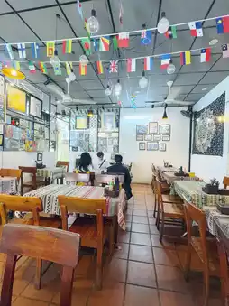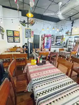 Unassuming from the outside, surrounded by greenery and stone walls, it's easy to miss. But once inside, you'll find a warm, homey atmosphere. Vietnamese-style decorations adorn the walls, creating a simple yet warm feeling, evoking the familiarity of a friend's home.