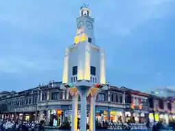 A small clock tower is located on Xijie Street, and nearby are twin pagodas dating back to the Song Dynasty.