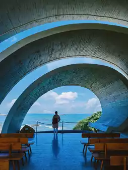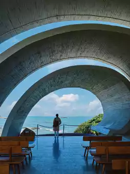 Standing in the chapel, you can use the irregular oval outline of the traffic to compose the picture. Outside is the blue sea and sky, which is very photogenic.
