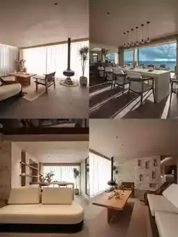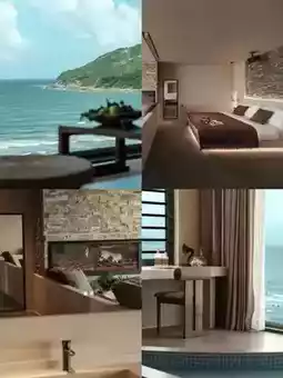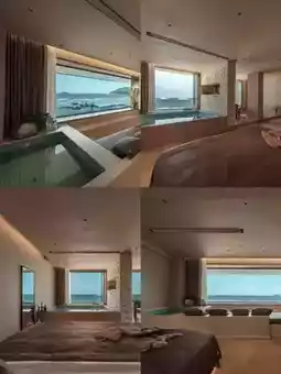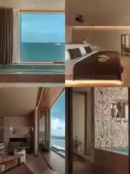 All 12 guest rooms face the sea, featuring floor-to-ceiling windows + king-size beds—watch the sunrise right from your bed (6-7 AM is pure magic! Boats drifting on sparkling waves, every phone snap turns into a masterpiece✨). Each room has a private hot spring pool! Moody grey tones + oceanic blues exude luxury. After soaking, lounge on the sofa for big-screen movies—so cozy you won’t want to leave!