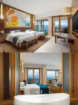 Our bay-view room offered a stunning view of the white sails dotting the yacht club right from the window! The room exudes a Southeast Asian resort vibe, with a blue-and-white color scheme and a hand-painted wave texture on the headboard wall, instantly amplifying the vacation mood. The attentive butler, Xiao Huang, was incredibly thoughtful, effortlessly handling every request, big or small.