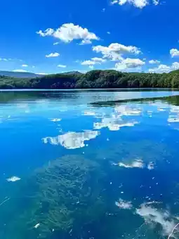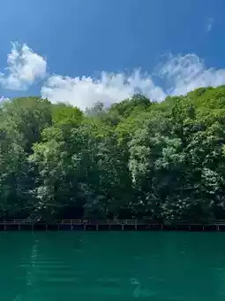 Parking here is free. After ticket collection, you’ll need to walk up a flight of stairs. My first impression was how clean it is—the lake water is crystal clear, so much so that you can see the bottom. It’s no wonder it’s called the "Blue Tear" of the volcanic lake cluster. The water is expansive, deep, and vividly blue, with plenty of small fish visible. I recommend taking a boat ride here (🚢 20 RMB per person, speedboat 🚤 30 RMB per person). It’s definitely worth it. Walking along the wooden boardwalk around the lake, the clear water reflects the forest and sky beautifully. Even photos taken with a regular camera turn out stunning. Highly recommended.