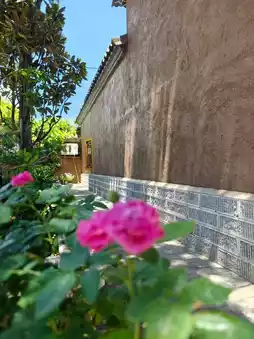 • A vibrant first impression: Is it the cluster of fuchsia bougainvillea blooming wildly by the archway? Or the crimson roses climbing the weathered walls, blooming with reckless abandon? (Images 1, 5, 9) Their exuberance sings a song of life, creating a striking dialogue with the tranquil gray tiles and walls, resulting in breathtaking contrasts.