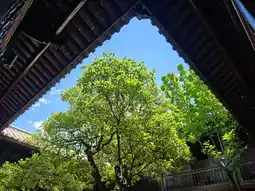 • Canopy of green, stolen moments: Look up to see the deep, rustic eaves framing a canvas of azure sky (Image 7). Ancient trees, lush and vibrant, glow under the sunlight with layers of radiant green leaves (Images 7, 8). Beneath the trees, wicker chairs in shaded corridors (Image 6) invite you to sit, sip tea, read, listen to the wind, and watch clouds drift by. Here, time flows gently, offering a stolen moment of tranquility.