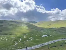 Winding roads, like silver ribbons, weave through the sea of grass, guiding explorers on their journey. White tents, scattered like pearls, bring a hint of human presence to this secluded haven. Most captivating are the horseback travelers, their figures so small against the grandeur of the scenery, yet perfectly harmonized with the majestic landscape. The mountain breeze carries the crisp sound of horse bells, evoking echoes of ancient times along the Tea Horse Road.