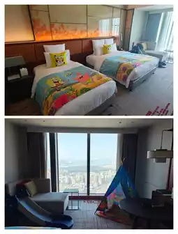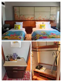 This family room has a nominal area of 60 m², which is slightly larger than the 42 m² basic room type. It has two beds, one 1.8 m and one 1.3 m, which are enough for three adults. The overall style is SpongeBob themed, with a fun tent and slide added to the floor-to-ceiling window, which enhances the parent-child configuration.