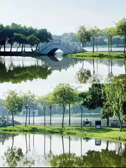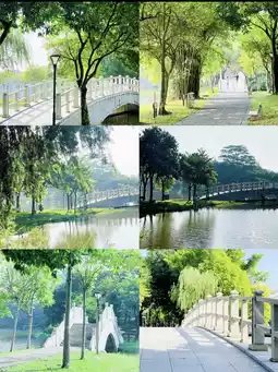 You see small bridges, flowing water, and houses; the morning sun rises slowly from the bridgehead, the lake surface ripples gently, and birds chirp nonstop among the bamboo groves. Isn't this the legendary water town of Jiangnan? The pictures of this park I found online mostly look modern, with lakes, bald cypresses, bridges, and skyscrapers, which is completely different from what I see here. I think the photographers didn’t capture the other kind of beauty this scenery presents.