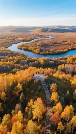 In the morning, visit the Birch Forest Scenic Area (entrance fee 60 RMB). The golden leaves are translucent like paper under the sunlight. Walk the boardwalk, take photos, swing on the swings—it feels like stepping into a fairy tale. In the afternoon, climb to the high point of Genhe Wetland (free). Overlook Asia’s largest wetland—the winding rivers like veins, colorful forests interlaced, migratory birds flying south, magnificence beyond words. At dusk, pass by the popular photo road, flanked by golden trees, driving through feels like entering a painting.