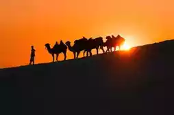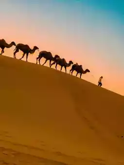 At 7 p.m., the desert transforms into a golden treasure trove. Camel caravans tread on scattered gold, their silhouettes stretched long and thin like molten threads stitching the sky and earth together. Every grain of sand kicked up by the camels becomes a glowing star, revealing that even the wildest desert holds the gentlest romance.
