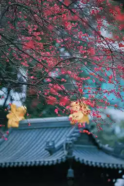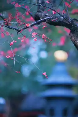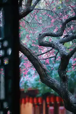 Suddenly, the chanting of Buddhist scriptures rings out, startling the plum blossoms under the eaves, causing them to flutter down like verses waiting to be written on the tiles. Those who come to admire the blossoms are seeking a touch of poetic inspiration amidst the mundane world, while those who linger can no longer distinguish whether they have come to find plum blossoms or to accept an invitation from the thousand-year-old misty rain that has condensed into the vermilion red on the branches.