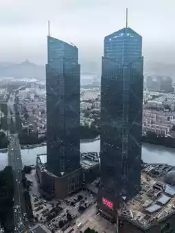 Dongwu Twin Towers framed with the ancient-modern landmark Renhuang Pavilion