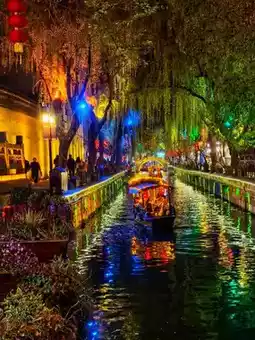 The ancient riverside houses, covered corridors, and horse-head walls are carefully outlined by warm yellow lights, reflected on the ink-black water surface. The light and shadow are no longer as straightforward as during the day but become soft and profound, magnifying the beauty of the architectural lines to the fullest.
