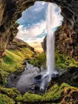 Seljalandsfoss is one of Iceland’s most famous and beautiful waterfalls, located along the South Coast. It drops about 60 meters from ancient sea cliffs and creates a misty, magical scene. What makes it special is the path that lets you walk behind the waterfall, offering a rare and thrilling view from inside the cascade. When the sun shines, rainbows often appear in the mist, making it perfect for photos and peaceful moments.