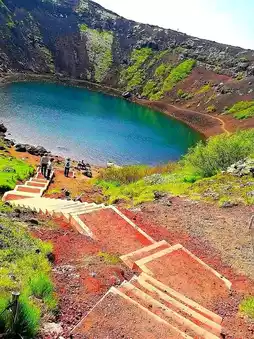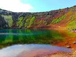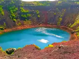 In summer, Kerið Gígur in Iceland transforms into a vivid masterpiece of color and light. This ancient volcanic crater, part of the Golden Circle route, is about 3,000 years old and filled with a striking turquoise lake at its heart. The steep, red and orange volcanic walls contrast beautifully with the calm blue water and the green moss growing along the edges, creating a breathtaking natural palette. Visitors can walk around the rim or descend to the lake’s edge to feel the peaceful atmosphere surrounded by raw geological power. In summer sunlight, the colors become even more intense, and reflections on the water create a mirror-like effect. Kerið is part of Iceland’s volcanic story, believed to have formed after a cone volcano collapsed into its empty magma chamber. Its unique shape and color make it one of the most photogenic and magical spots in Iceland.