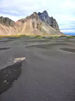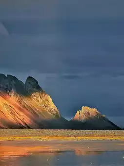 Vestrahorn, often called “Batman Mountain,” is one of Iceland’s most dramatic and photogenic natural wonders, located on the Stokksnes Peninsula in southeast Iceland. Rising sharply from the black sand beach, its jagged peaks—reaching up to 454 meters—create a stunning contrast against the Atlantic Ocean and the endless sky. The mountain’s dark tones and unique shape make it a favorite among photographers, especially at sunrise or sunset, when the light paints the landscape in gold and pink hues. On calm days, the wet sand reflects the mountain perfectly, forming a mirror image that feels almost unreal. Nearby, dunes covered in grass sway in the coastal breeze, adding softness to the rugged scenery. The sound of waves and wind completes the peaceful yet powerful atmosphere. Vestrahorn embodies Iceland’s wild beauty—mystical, raw, and unforgettable.