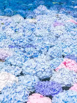 The pond is adorned with colorful hydrangeas floating on its surface, creating a breathtakingly beautiful scene 🫧