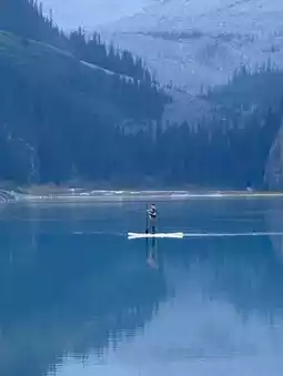 It sits beneath Mount Victoria and Victoria Glacier, creating a postcard-perfect backdrop year-round.