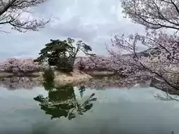 It is surrounded by several high and distant cherry blossoms and snow-capped mountains