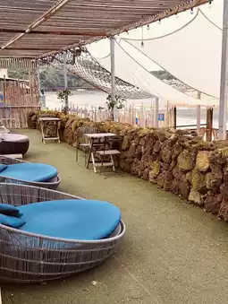 Highbada's outdoor seating area has an exotic, almost resort-like feel, making it a fantastic place for photos. The space is large, so it’s great for group visits. The beach is right in front, so you can relax with a drink and take in the view. The only downside is that there isn’t a faucet to wash off sand, so if you walk on the beach, be prepared for a bit of a hassle. Other than that, the atmosphere is fantastic, and I’ll definitely be back! 📸🌴