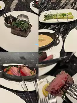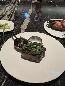 I had the caviar set. Starting with two glasses of Bollinger as an aperitif, the caviar plate with chopped salad, tuna, and crab meat. For the main course, sirloin steak with asparagus onion mashed potatoes!